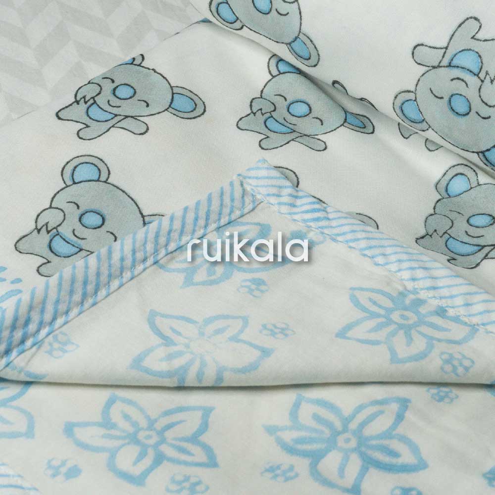 Expertly crafted Kid's Dohar featuring handblock mul cotton fabric on both sides with a soft flannel sheet sandwiched between layers for optimal comfort and warmth. These premium dohars showcase charming prints, making them perfect for your little one's delicate skin while providing the right balance of coziness and breathability.