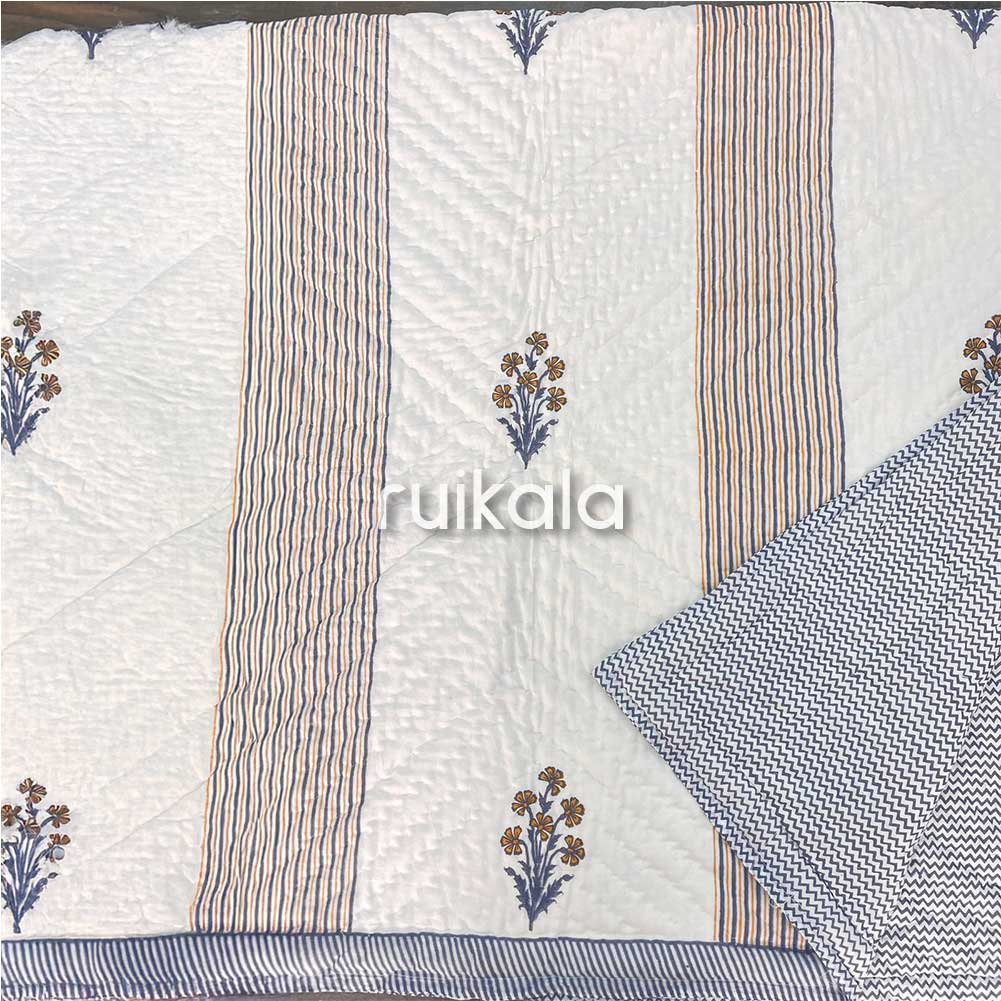 Experience the craftsmanship of Handblock Quilts, featuring handblocked mul cotton fabric on both sides with soft cotton filling inside. Each quilt is meticulously hand-stitched, ensuring durability and a unique artisanal touch. Ideal for adding warmth and elegance to your living space with authentic handmade quality.